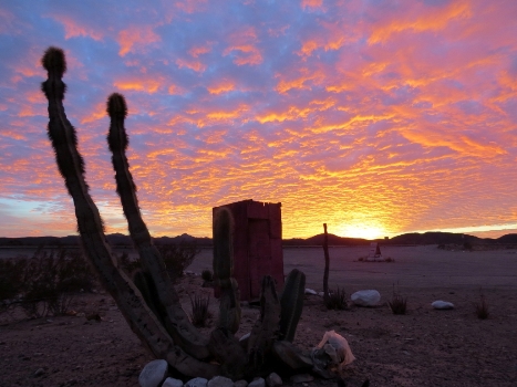 Und ab in die Berge. Wir wollen südlicher, auf die östliche Seite der Baja, an den Golfo de California. Die Strasse ist gut …. oftmals sehr schmal. Wer hier mit den Reifen über die Fahrbahnmarkierung kommt …. hat gelitten. Die herrliche Berglandschaft, bewachsen mit den riesigen Sonora-Kakteen zieht sich. Wir fahren nicht mehr zu unserem geplanten Ziel, dem Campground in San Ines. Wir stoppen und übernachten am Sonora-Gift-Shop . Wer Alles dabei hat, kann hier für 1,50 US$ sicher übernachten … zum campieren, wie es auch im Camping-Buch steht, ist der Platz nicht zu empfehlen.!!! Als Belohnung bekommen wir mal wieder einen tollen Sonnenuntergang zu sehen.