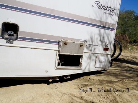 Diesmal zieht es uns in die Berge. Wir suchen die Hot Springs bei Santiago….Rancho Rita. Bisher haben wir nur wenig Beschreibungen … von Mund zu Mund. Fred zeigt auf sein Womo … ob er die Strecke damit fahren kann? „Si, no Problemo“. Mal wieder schalten wir die Walky-Talkys ein … fahren voraus. An einem Gutter sind große Auswaschungen … zu tief für die Länge von Freds Womo. Fred möchte, daß wir die Strecke abklären, bevor er mit dem Auffüllen der Auswaschungen anfängt. Wir geben die Strecke frei. Fred trifft alle Vorbereitungen … zehn Minuten später sitzt er fest.