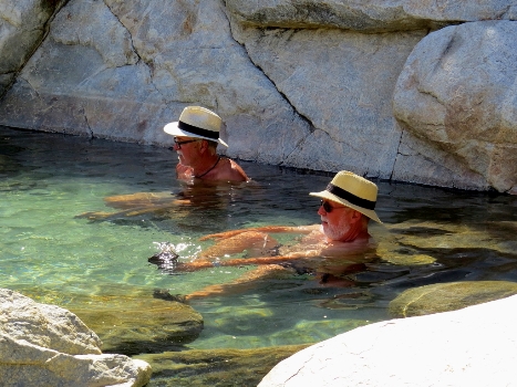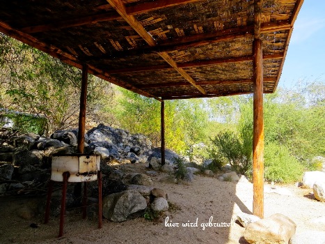 Gut ausgeschlafen nehmen wir eine weitere Sandpiste in Angriff. Agua Caliente … auch hier gibt es Hot Springs…. 50 Pesos für Pools und Übernachtung. Die schattenspenden Palapas sind bei der heutigen Hitze eine Wohltat … die Pools nicht unbedingt eine Abkühlung, jedoch sehr angenehm. Für das leibliche Wohl gibt es heute Kartoffelpuffer … nur gut, daß wir eine Outdoorküche haben.