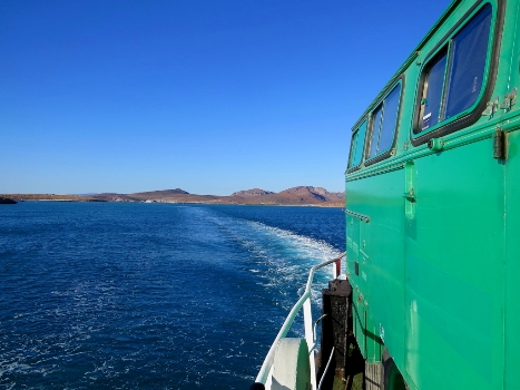 Noch einmal nach La Paz … Wasser auffüllen, entsorgen, einkaufen. Die letzte Nacht verbringen wir in Tecolote am Strand … von hier ist es nicht weit, bis zur Fähre. Pünktlich, wie bestellt, fahren wir um 13.00h mit unseren zwei Campern bei TMC vor. Der Ablauf ist perfect, wir bezahlen, bekommen unsere Tickets, inclusive Abendessen und Frühstück. Wir sind die einzigen Camper unter den vielen Trucks und Hängern… dürfen als erste auf die Fähre. Mit dem Lift geht’s hinauf auf das offene Oberdeck …. direkt neben die Reeling.