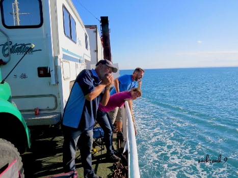 Gegen 16.00h ist die Fähre voll beladen. Vom Schrotthändler bis Bierhänger … alle sind mit an Bord. Zum Schluss kommen noch drei lustige Australier mit ihrem Camper … auch für sie findet die Crew noch ein Plätzchen an der Reeling. Fazit: eine Buchung mit TMC auf der Trucker-Fähre können wir nur empfehlen!