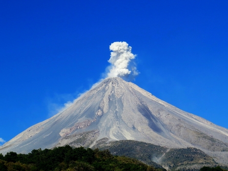 Für uns ist es der letzte Abend am Pacific. Die nur knapp 20m entfernten Wellen machen einen gehörigen Schlag … hören sich in der dunklen Nacht noch lauter an. Schweren Herzens verlassen wir am nächsten Morgen unsere letzte Station am Pacific. Wir sind gespannt auf das mexicanische Hochland. Unser erstes Ziel … der Volcan de Colima. Vom Campground „La Maria“ fahren wir noch einmal weitere 3,5 km auf der holprigen Pflasterpiste, um einen guten Ausblick auf den Volcan zu haben. Wir parken Pummel … wie auf Bestellung fängt der Vulkan an zu „pusten“. Wir sind hin und weg begeistert.