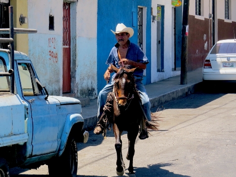 Das Klima ist angenehmer … heiß, aber trocken. Unser Ziel für heute ist „Laguna Chapala“, der größte See Mexicos. Vorher wollen wir im Ort Queseria (Käserei) frischen Ziegen- und Schafskäse kaufen. Wir folgen unserer GPS-Tante und landen mitten in der Stadt. Die Stadt ist nicht verführerisch … dafür aber verliererisch. Kopfsteinpflaster, enge, steile Einbahnstraßen, Topes mit oder ohne Vorwarnung, entgegenkommende Cowboys… hier streikt selbst die TOM-TOM-Tante. Unser Walky-Talky erweist sich mal wieder als sehr praktisch. Wir versuchen Jeder auf seine Reise …. aus diesem Ziegen-Kaff rauszukommen. Nach einer ½ Stunden geht die deutsch/schweizer Bummelei wieder weiter.