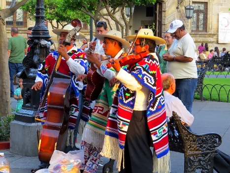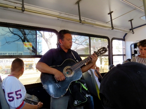 Mit mehr als 1.5 Millionen Bewohnern ist Guadalajara die zweitgrößte Stadt Mexicos. Wir nehmen den Bus … fahren bis zum Centro. Es wird uns nicht langweilig während der einstündigen Fahrt … selbst hier singt und spielt man mit der Guitarre.
