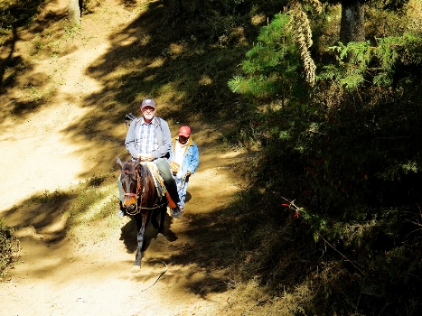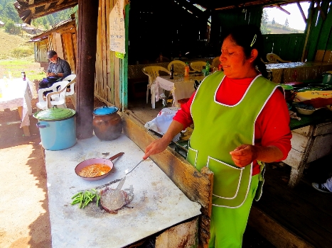 Steil bergab geht es wieder runter zu Pferde. Sigo sitzt das erste Mal in seinem Leben im Sattel … ist total begeistert. Um den Parkplatz herum sind die kleinen Garküchen vor den Hütten aufgebaut. Heute hat nur noch eine geöffnet … wir lassen uns mit Hühnersuppe, Fleisch und Gemüse verwöhnen.