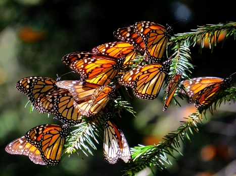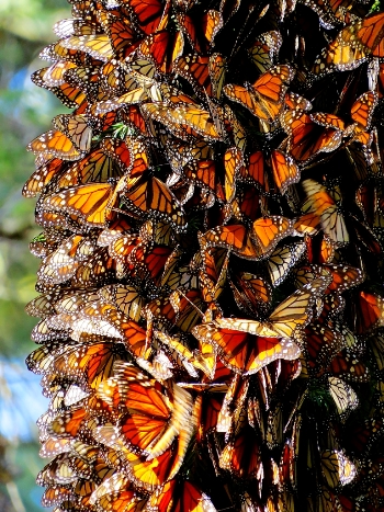 Die Monarchfalter kommen im Herbst in diese Region von Mexico …verbringen dicht gedrängt, in Trauben hängend, ihren Winterschlaf. Im Januar-Februar sorgen sie für ihren Nachwuchs … Ende März begibt sich die neue Generation auf den weiten Weg nach Canada. Es ist nicht bekannt, warum, weshalb und wie sie diese weite Entfernung von fast 5.000 km in Angriff nehmen. Für uns haben sich die 450 km Umweg auf jeden Fall gelohnt.