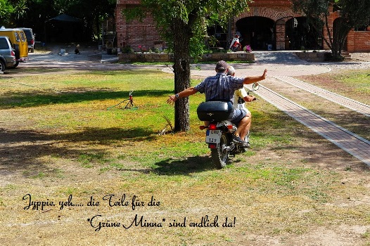 19.00 Uhr, die Kupplung ist eingebaut. Willi rollt die Markise ein, macht eine Proberunde .... „Morgen haue Ich ab“. Vorher gehen wir gemeinsam brunchen … diesmal auf unsere Rechnung.
