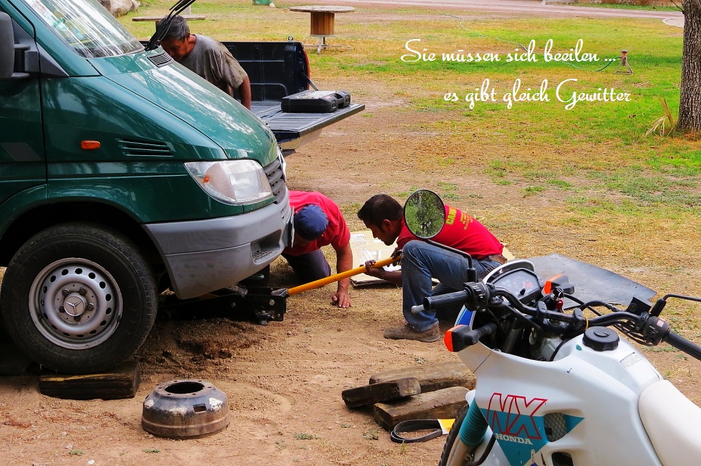 Es ist ein Wettrennen …. die Teile für die Grüne Minna sind da, der Werkstattmeister sagt „die Teile sind falsch!“ Für Willi bricht eine Welt zusammen …. nicht wegen der Steaks, nein… die Unkosten und möglicherweise noch einmal drei Wochen warten. Auch wir sind geschockt. Am späten Samstagnachmittag kommen die drei Mechaniker und legen mit den angeblich falschen Teilen los. Am Himmel kommen dunkle Wolken auf … es kracht und blitzt. Noch hält sich der Regen zurück. Die Spannung steigt während Klitschko schon längst gewonnen hat … weiß Willi noch nicht, ob die Kupplung für seine Grüne Minna funktionieren wird.