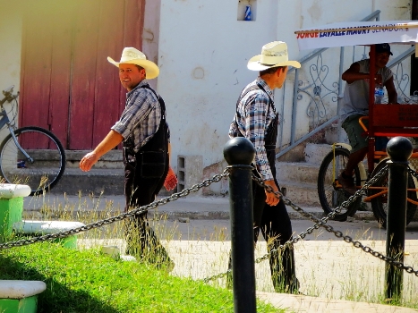 Wir fahren über Hopelchen … hier fallen die „Blonden“ in ihren Latzhosen und Jipijapa-Hüten sofort auf. Die Frauen sieht man eher selten … sie tragen dunkle, lange Röcke und Kleider … gehen nicht so gerne einkaufen wie ihre Männer.