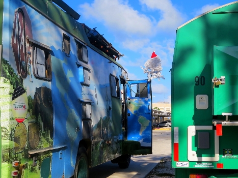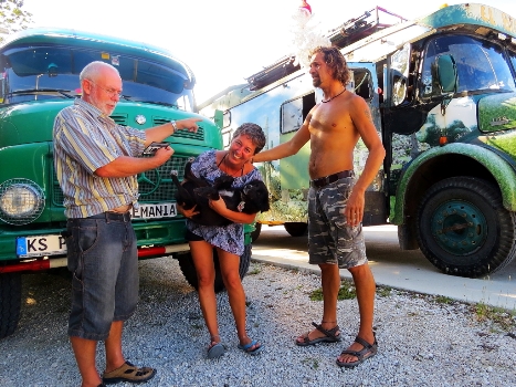 Welch eine Freude, wir fallen uns mit Shanti und Matu sofort in die Arme … sind allesamt aus dem „Häuschen“. Shanti ist in Belgien geboren, lebt seit vielen, vielen Jahren in Argentinien und ist mit Matu seit acht Jahren in ihrem „El Bicho“ unterwegs. El Bicho war ein ehemaliger Passagierbus … bevor die Beiden ihn zu ihrem gemütlichen ZuHause umgebaut haben. Sie haben Südamerika ausgiebig bereist. Zaina, ihre Tochter ist während der Reise in Equador geboren. El Bicho wurde nochmals umgebaut … jetzt brauchten sie ein Himmelbett … die Reise ging weiter.