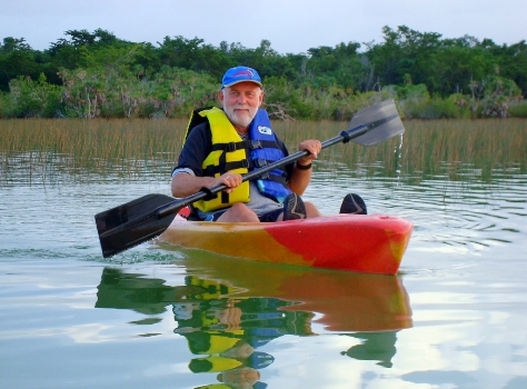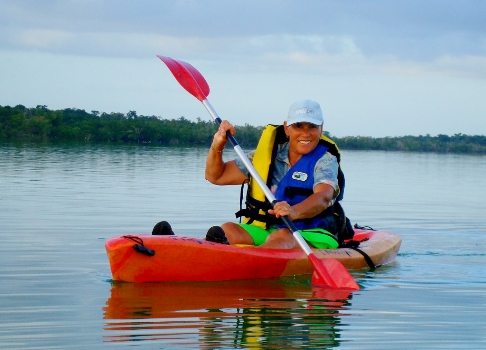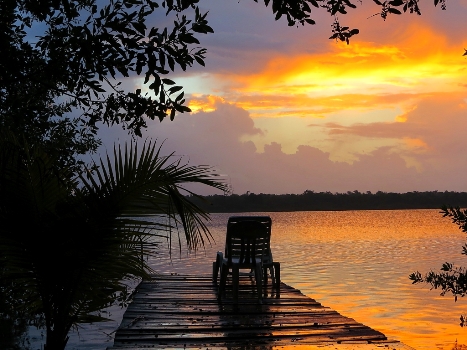 Wir halten durch, bis der lange Regen endlich aufhört … bei totaler Windstille leihen wir uns von Fritz die Kayaks, paddeln über die Lagune Bacalar.
