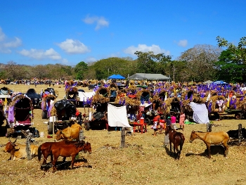 Endlich … wir sind auf der NIC 2 in Richtung Süden. Auf einer riesigen Weide bietet sich uns eine tolle Kulisse. Wir schätzen ca. 300 Ochsen- und Pferdekarren … alle mit Stroh bedeckt und zu einer Art „Campingwagen“ ausgebaut. Mit Pötten und Pfannen, Feuerholz und Decken, sogar mit Hühnern haben sie sich für dieses Treffen vorbereitet. Es ist ein kirchliches Treffen von verschiedenen Gemeinden aus ganz Nicaragua. Alles ist super gut organisiert … provisorische Toiletten sind aufgebaut, Frischwasser gibt es per Wassertank-Fahrzeug. Eine harmonische, fast Volksfeststimmung … selbst hunderte von Pferden und Ochsen vertragen sich... wir sind von dieser Szenerie total begeistert.