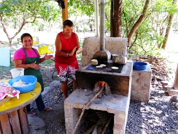 Bevor die Schüler wieder abreisen , werden sie im Restaurant mit Essen versorgt. Ich „helfe“ Maria beim Backen der Tortillas.