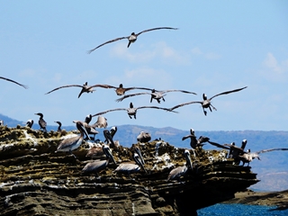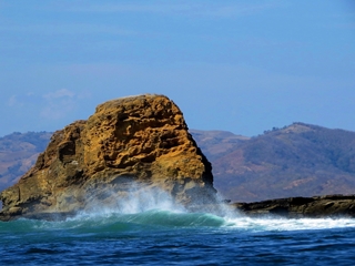 Die Abende verbringen wir gemeinsam mit den anderen Gästen und lassen uns bei feinster Küche, selbstgemachten Obstweinen von Adi und Guido verwöhnen. An einem Tag nimmt uns Agi mit nach La Cruz … treffen uns mit Frank aus Deutschland, der ebenfalls seit 18 Jahren hier lebt. Frank betreibt unter anderem ein Tauchgeschäft … heute bringt er uns mit seinem Boot zur Vogelinsel Bolanos. Die Windvorhersage für heute … 12 Knoten, genau richtig für einen Bootstrip mit offenem Dinghy. Vorhersagen stimmen selten … das kennen wir von unserem Segelleben in Australien. Aus den 12 Knoten werden mindesten 20 … nicht viel, aber gegen die sich aufbauenden Wellen dauert die Hinfahrt zur Insel doppelt so lang. Wir passieren Felsen im Wasser … hunderte von Kormoranen und Pelikanen haben sich hierauf niedergelassen.