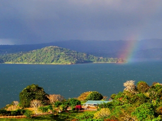 Wir sind zufrieden … fahren weiter in Richtung Lago-Arenal. Der Stausee ist mit 80 qkm der größte Binnensee Costa-Ricas. Kurvenreich, eng und bergig, führt die CR142 oberhalb des Seeufers entlang. Immer wieder haben wir tolle Ausblicke auf den See … auch auf die dunklen Wolken samt Regenbogen.