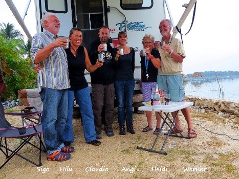 Tja, wo genau treffen wir unsere Schweizer Freunde? Fahren wir erst einmal zum Einkaufen nach Flores … morgen soll ja Silvester sein. Im ersten Supermarkt spürt uns Kurti auf …. „wir haben letzte Nacht mit Euren Freunden gemeinsam in Flores verbracht, sie sind auf dem Weg hierher!“ Tatsächlich, draußen begegnen wir den Beiden ...die Wiedersehensfreude ist groß. Gemeinsam fahren wir an den Lago Peten Itza bei El Remata … campieren dort am Hotel/Restaurant und Trailer-Park El Muelle. Wir stehen dort direkt am Ufer des wunderschönen Sees … keine zwei Meter bis zum kristallklaren Wasser. Eine Stunde später kommen Heidi und Werner aus Künzelau auf den Platz gefahren … wir baden und plaudern gemeinsam im warmen Seewasser.