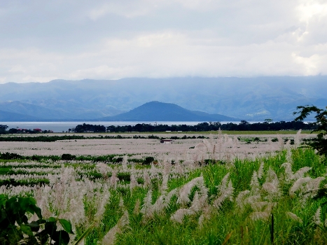 Am nächsten Tag begeben wir uns auf den Weg zum Lago de Izabal, dem größten See Guatemalas. Die Straße (CA13) läßt sich super fahren. Vor Rio Dulce biegen wir rechts ab, um am nördlichen Seeufer bis zur Finca Paraiso zu fahren. Jetzt wird die Fahrt rumpelig … die leicht rosa blühenden Zuckerrohrfelder und der Blick auf den riesigen See sind eine Entschädigung. Nach ca. 25km erreichen wir die heißen Wasserfälle, die wir erst einmal rechts liegen lassen. Wir fahren noch die 3km zum See … hier gibt es am Ende vier Campingplätze. Wir nehmen den Rechten ... El Mangal. Michele und Kurti campen wie erwähnt, bereits hier.