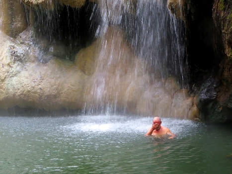 Auf rutschigem Pfad laufen wir am Fluß entlang zu dem heißen Wasserfall. Dieser ergießt sich in den normal kalten Fluß … es kommt Schwaden auf. Sigo watet durch den Fluß bis zur Höhle unter dem Wasserfall. Je mehr er sich dem Wasserfall nähert, umso heißer wird es. Durch eine Öffnung kann er heraus … aalt sich im jetzt 40 Grad warmen Wasser.