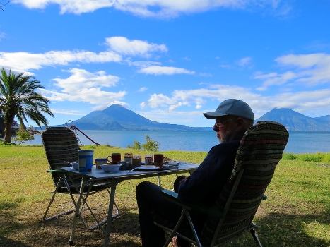 Erstmal stehen wir allein auf dem Campingplatz Hotel Vision Azul … aber es wird eine turbulente Woche. Chris und Harald aus Hamburg gesellen sich zu uns … zwei französische Wohnmobile mit zwei Kindern kommen an ... am nächsten Tag ein 50 Jahre alter VW-Bus aus Frankreich ebenfalls mit zwei Kindern … ein VW-Bus aus Oregon mit einem Kind ... Julien und Barny aus Canada mit Hund ... ein weiteres Fahrzeug aus Frankreich mit drei Kindern ... am Ende kommen noch die beiden Radfahrer aus Australien, die wir bereits in Belize und Tikal getroffen haben. Unglaublich, aber wir sind wirklich in Guatemala.