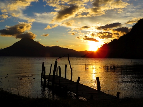 Lago de Atitlan, bekannt als „der schönste See der Welt“. Eingerahmt ist der blaue See von Vulkanen und kleinen Maya-Dörfern. Wir stehen auf der Nordseite vom See … einen Kilometer vor der Touristenstadt Panajachel.