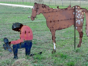 Für Texas fehlen uns noch typische Bilder. Wir sind auf der Suche, bei Regen, leider nur schwer. Unser Lunch findet auf einer eingemüllten Wiese statt. Kaum den Kaffee im Pott, die ersten Stimmen durch eine Hecke. Man ist neugierig, lädt uns ein, hinter die Hecke zu kommen. Dahinter ist eine Ranch. Wir nehmen die Einladung an. Der Farmer ist nett, erinnert uns an Ben Cartwright, Frau Farmer ist auch nett, interessiert sich für unserem Pummel. Eine interessante Begegnung, wir können am Feuer bleiben. Der Ur-Ur-Großvater ist 1840 von Deutschland hierher ausgewandert. Wir machen ein paar Fotos, bekommen ein T-shirt und ein Cappy geschenkt. Wir erwähnen unser nächstes Reiseziel, „Garner-Statepark“. Auch dieses Land hat zum Teil dem Ur-Ur-Großvater gehört.