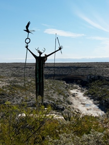 Seminole State Park, eine eiserne Figur überwacht die Schlucht. Das Motiv, übernommen aus den Felsenmalereien der Apachen….tausende von Jahren alt. Moderne Grafitti, ebenfalls in den Felsen verewigt, …ca. 200 Jahre alt, sind Zeitzeugen der Eisenbahnarbeiter. Die Union Pacific fährt heute noch ihre langen Transporte auf der alten erbauten Strecke durch die Berge. Unser Stellplatz bietet uns eine Rundumsicht über Berge und Schluchten. Aufbruch….auf nach Big Bend, National Park.