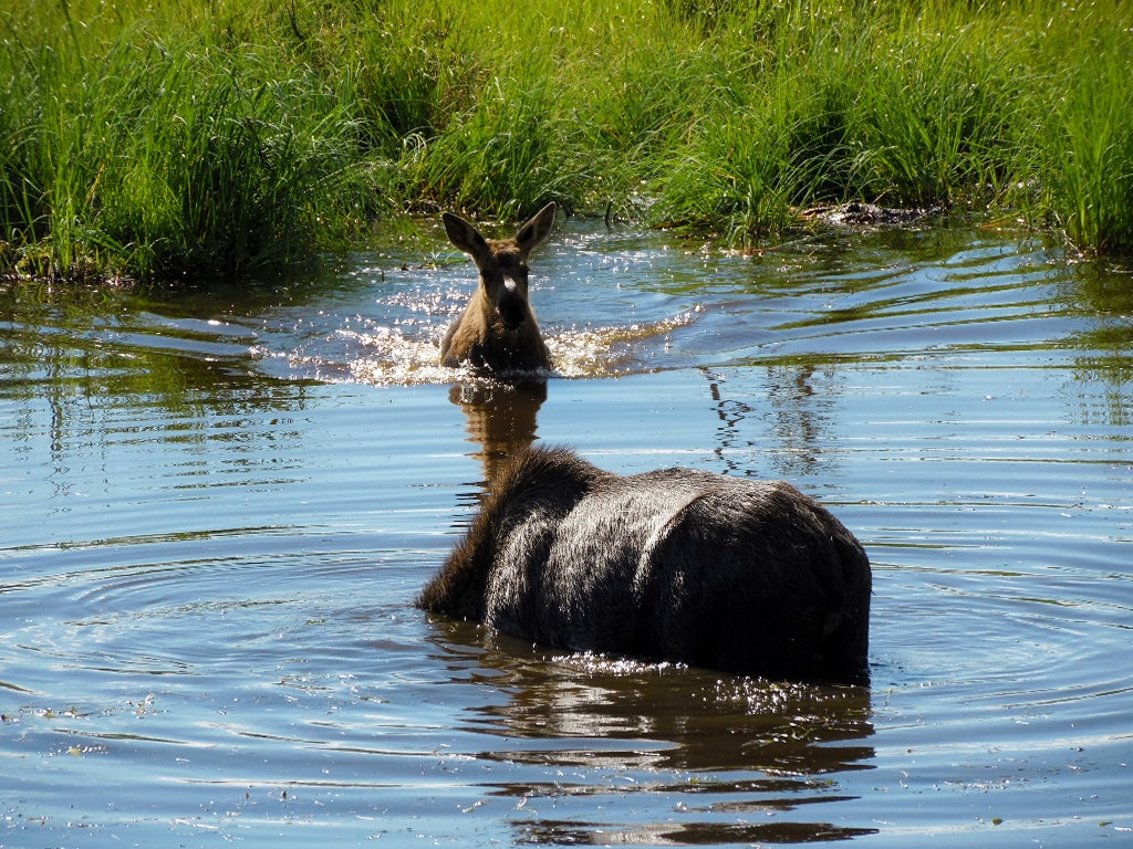18.07.2013, länger als zwei Monate in Nordamerika… inzwischen in Alaska. Etwas fehlt noch auf unserer Reise. Wir beobachten sie beim Morgenbad….. eine Elchkuh und ihr Kälbchen, können kaum loslassen, von diesem schönen Anblick.