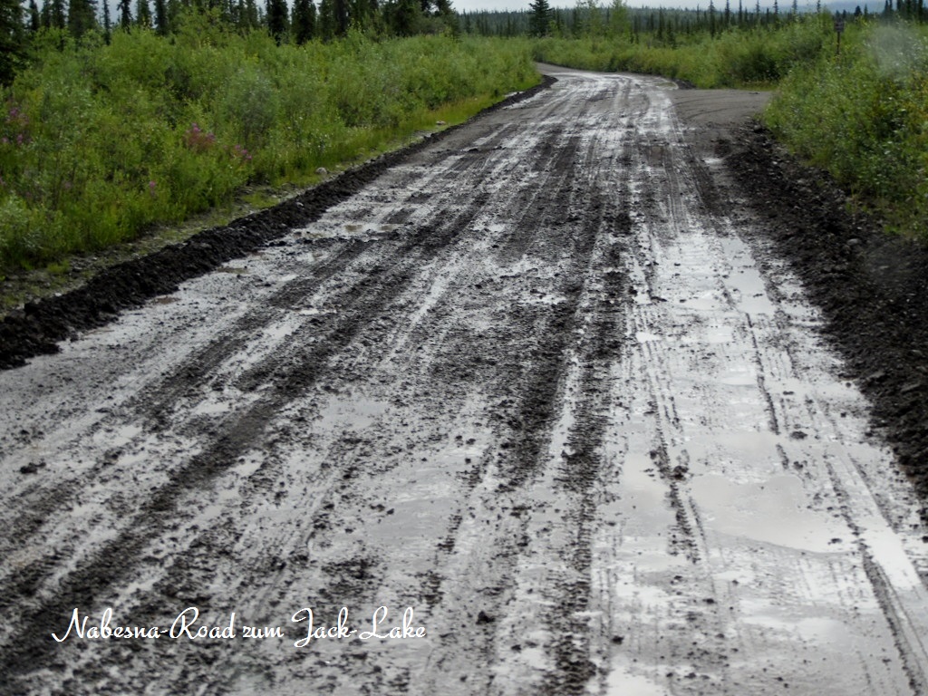 Ein Abstecher auf der Nabesna-Road in den Wrangell-St.Elias , Americas größtem National Park. Diesmal Gravelroad … schön aufgeweicht vom Regen.