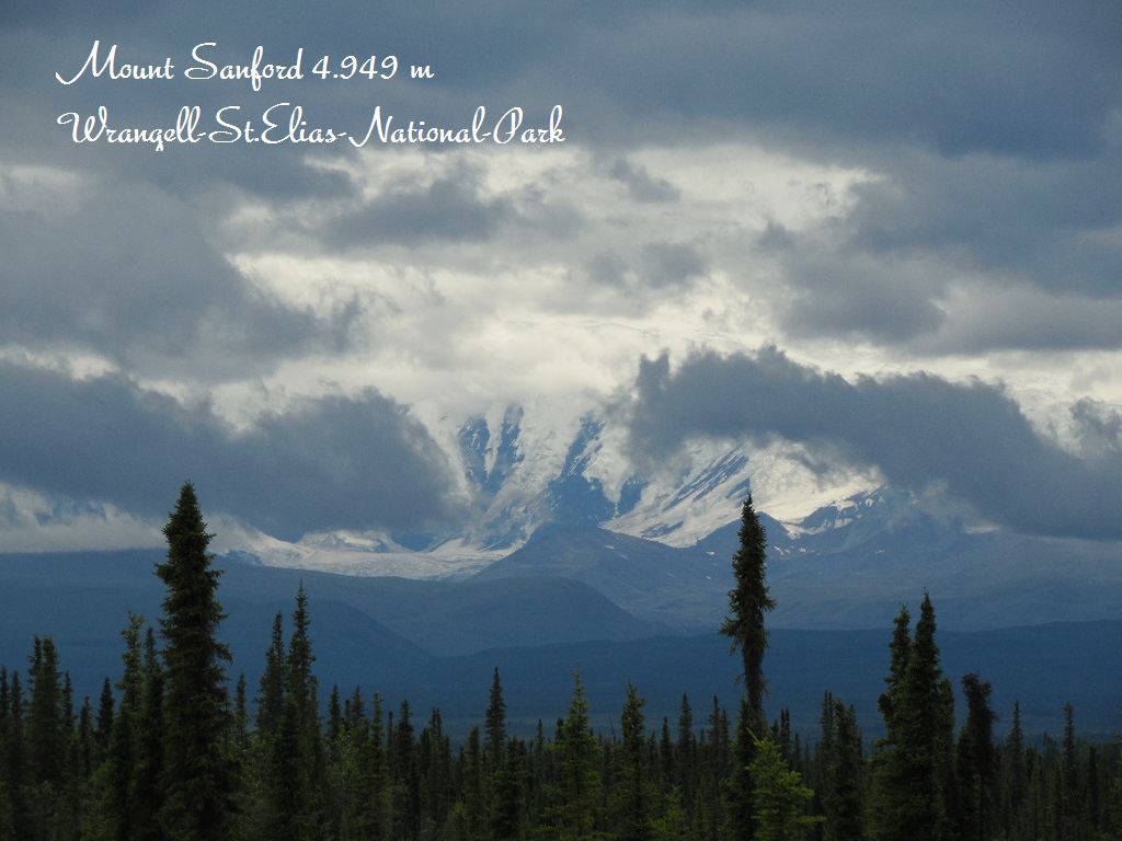 Aufbruch, wir wollen in den südlicheren Teil des Wrangell-N.P., auf die Mc. Carthy Road, 60 miles gravelroad. Bis dorthin ….. noch ca. 130 km auf dem Tok Cut-off Hwy, vorbei an Mount Sanfort und Mount Wrangell. Die 5.000der sind zum Greifen nahe.