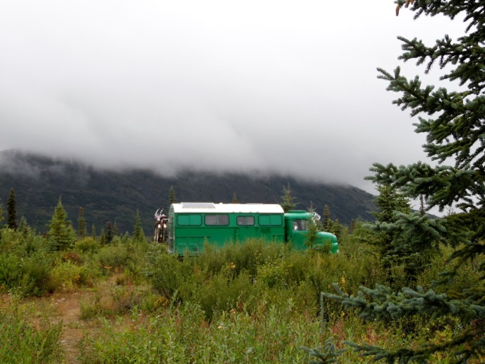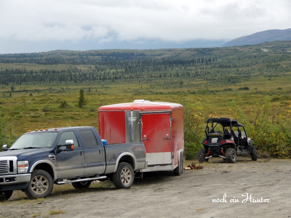 Nach den ersten 100 km erreichen wir die Berge der Alaska-Range, dicke Wolken nehmen uns noch immer die Sicht auf die Berge. Die Straße wird schlechter… noch mehr Schlaglöcher, noch mehr Schmutz für Pummel. Das Bremsgestänge der Motorbremse ist total verdreckt … blockiert beim Bremsen. Einmal reinigen, einmal schmieren… und schon bummeln wir weiter, genießen das satte Grün der Denali-Hochebene.