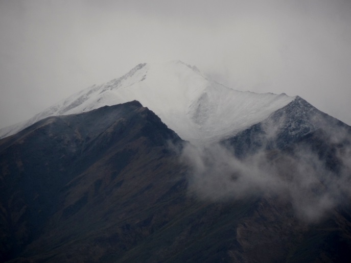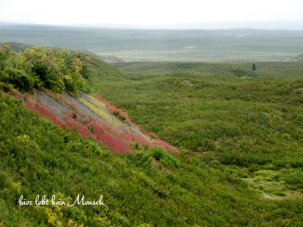 Die Nacht ist kristallklar, eisekalt …. am nächsten Morgen wieder Regen, auf den Bergspitzen (2.000m) liegt sogar Neuschnee. Wir nehmen die Strecke in Kauf. Loch an Loch, mehr Schlamm als Gravel. Es ist Herbst geworden, nicht nur die Temperaturen haben sich von einem Tag auf den Anderen verändert. Die lila Farben des Feuerweeds sind verschwunden, das Laub der Büsche wird mehr und mehr gelb…. es wird nicht wärmer als zwölf Grad.