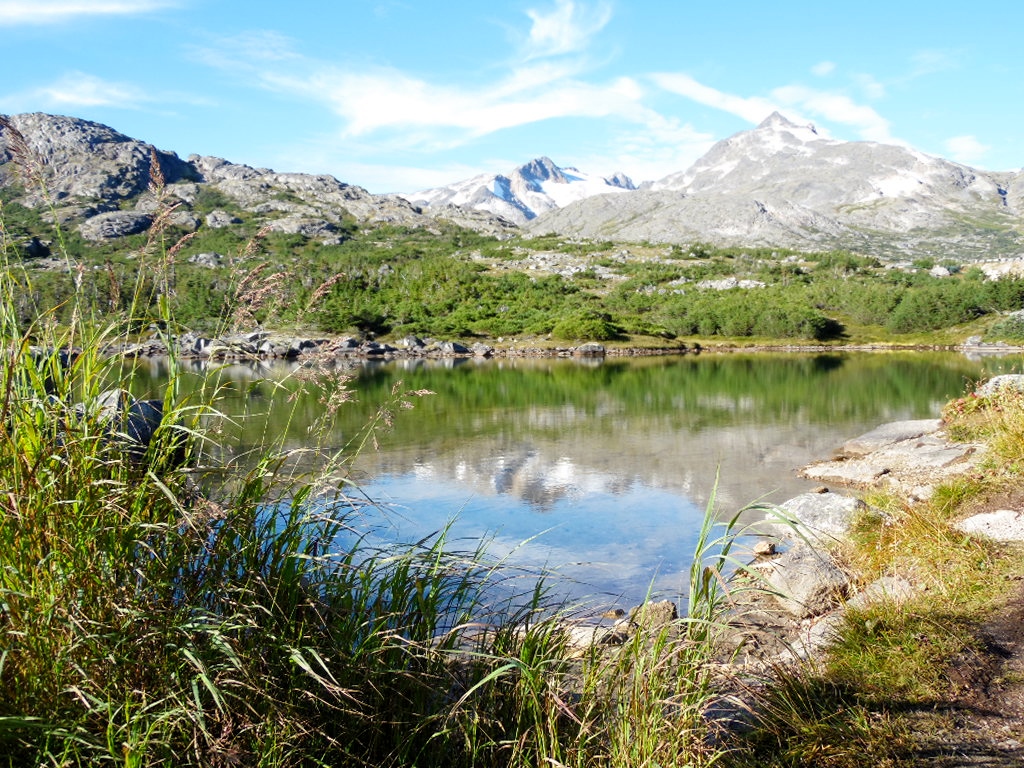 White-Pass, Grenzstation Alaska/Canada. Wir folgen der Yukon-Trail-Route, ca. 100km, bis Whitehorse. Fantastische Scenerie …. Berge, türkisfarbene Seen, Wüstenlandschaft, Oldtown Carcrossing , mit dem ältesten General-Store des Yukons, die ersten Eisenbahnstationen … bei herrlichstem Sonnenschein.
