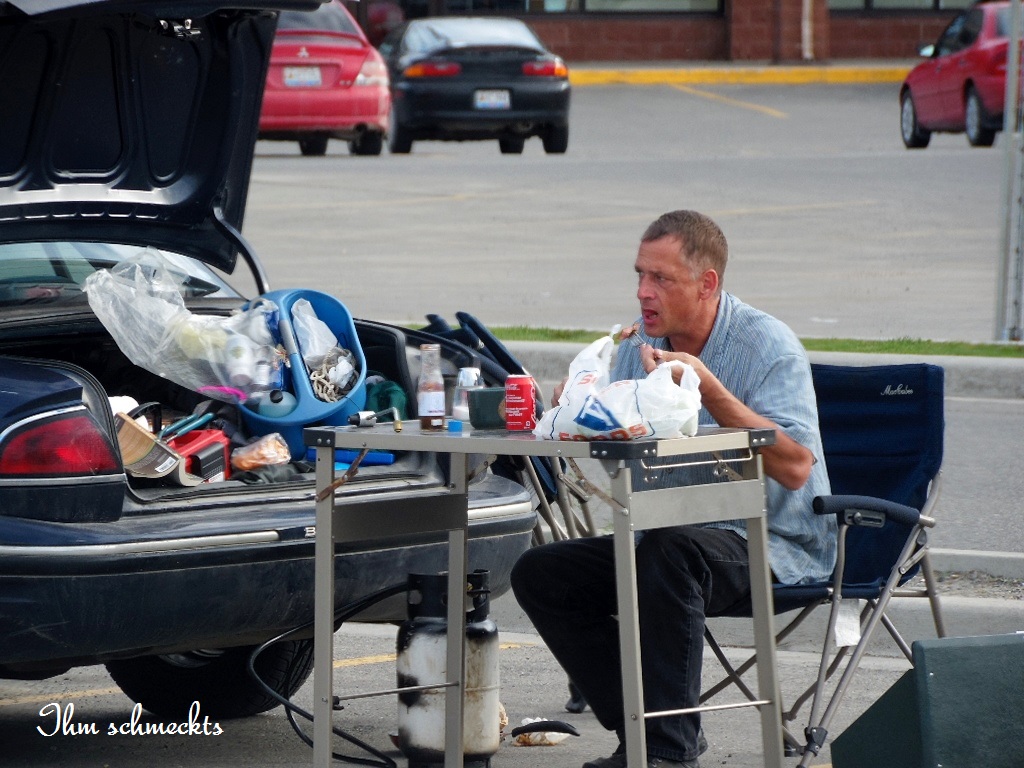 Einen weiteren Typen beobachten wir: Er hat nur ein Auto, packt jeden Morgen sein Inventar aus dem Kofferraum …. macht es sich auf dem Parklplatz gemütlich…am Abend backt er Pfannkuchen auf seinem Gasgrill. Ihr seht… Walmart ist immer gut für eine Story.