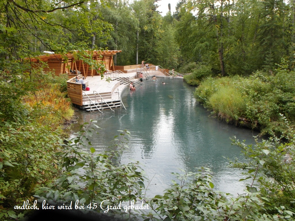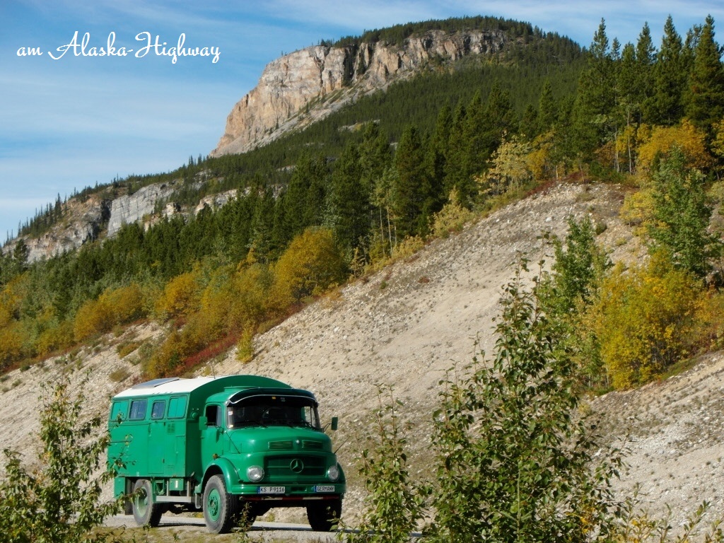 Der Alaska-Highway läßt sich wunderbar fahren….wenig Verkehr. Die herbstliche Landschaft wird von Tag zu Tag schöner. Wer hier meint der Highway ist eintönig, der ist viel zu schnell gefahren. Wir sehen an nur einem Tag „Trucks“ , Bisons, Bären, Wasserfälle und gehen am Abend in den Liard-River-Hot-Springs bei 45 Grad Wassertemperatur… baden.
