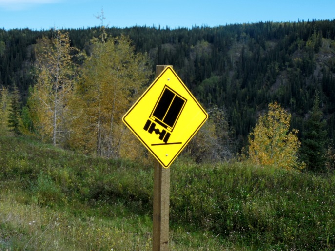 Weiter auf dem Alaska-Highway …. noch immer in Canadas British-Columbia. Die Überholmanöver der Trucks sind nicht nur nervig. Wir biegen ab, fahren den Hwy.29 in Alaska-Highway, weiter ab Mile 393. Die Strecke bleibt kurvenreich. Hinweisschilder fordern uns auf… ab hier dürfen wir nur noch auf zwei Rädern fahren. Kein Problem für Pummel.