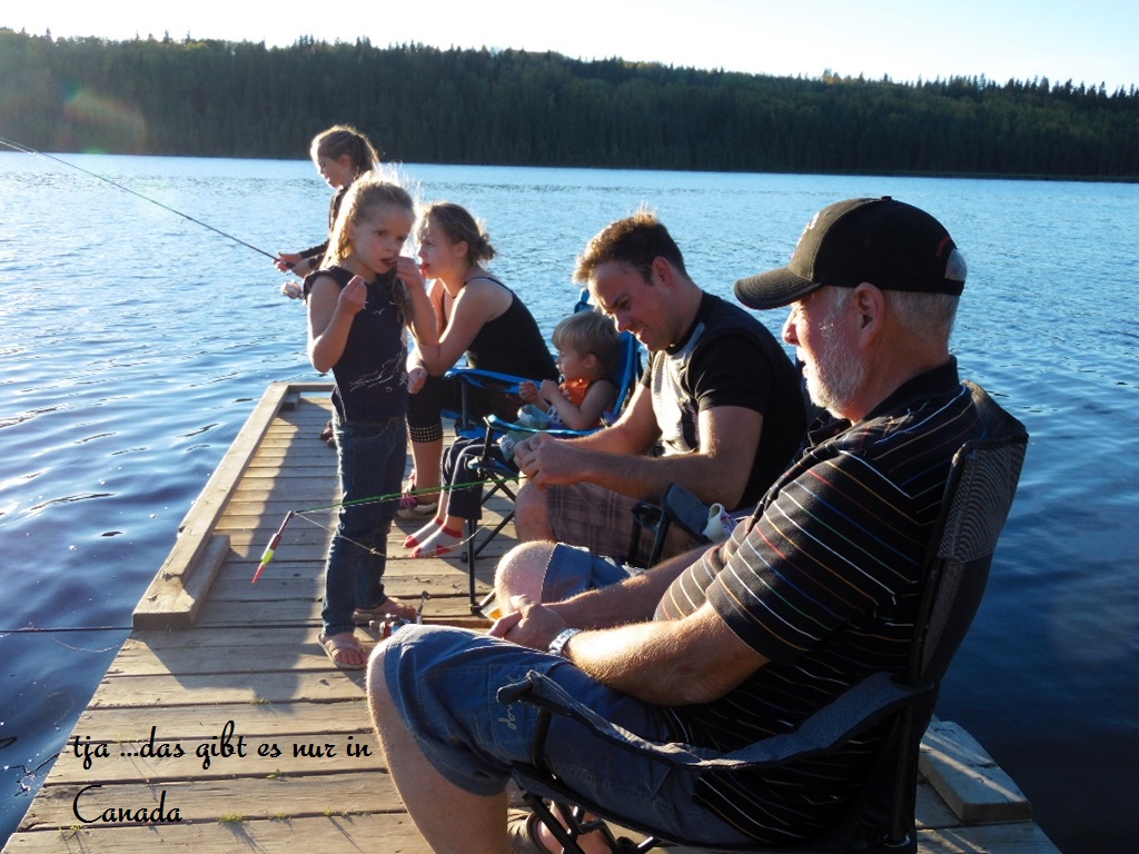 Keine Brise, Alles ist wieder friedlich. Bis zum Sonnenuntergang verbringen wir mit Simon, Elwira und ihren sechs niedlichen Kindern am Steg. Sie wohnen hier ganz in der Nähe, kommen oft zum Angeln an den See. Auch Simon arbeitet für eine der Gas-Companies. Miteinander sprechen sie russisch … die jungen Eltern sind beide in Deutschland geboren. Wir Alle zusammen unterhalten uns in drei Sprachen.