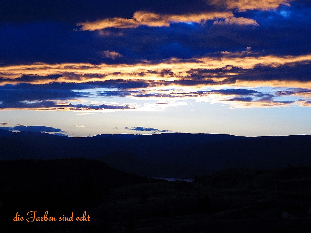Dauerregen …. wir fahren den Highway 97 entlang des Okanagan-Lakes gen Süden in Richtung Kelowna, auf indianisch heißt die Stadt „Grizzlybär“. Wegen des warmen Klimas leben inzwischen 100.000 „Grizzlybären“ (Einwohner ) in der drittgrößten Stadt British-Columbias. Hwy.97, ein wichtiger Zubringer von Nord nach Vancouver …. Verkehr, den wir nicht mehr gewohnt sind. Die Stadt, direkt am Okanagan-Lake gelegen …. wir bummeln am Yachthafen durch das Parkgelände und die nette Innenstadt. Leider ist „Grizzlybär“ nicht sehr camperfreundlich …. zu viele Parkautomaten und zu viele Schilder mit „no overnight-parking“. Wir fahren noch am Abend in die Berge, blicken zurück auf die Stadt und den Okanagan-Lake, bei einem fantastischen Sonnenuntergang.