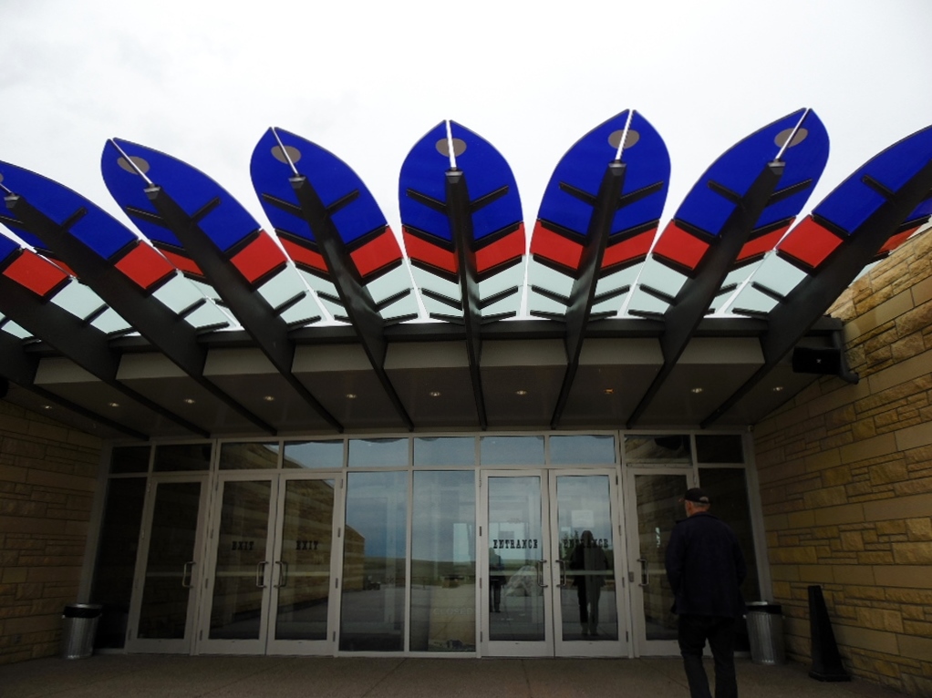 Die Architektur des Ausstellungsgebäudes ist historisch indianisch gemacht. Gläserne Federn als Eingangsüberdachung, Pfeil und Bogen als Trägerkonstruktionen, Tippis vom Dach bis in die untere Etage…..eine Nummer kleiner, ließe es sich toll drin wohnen. Die Ausstellung über das Leben der Blackfoot Indianer ist sehr farbenfroh, wir sehen uns Filme von verschiedenen Zeremonien an……fotografieren ist leider nicht erlaubt.