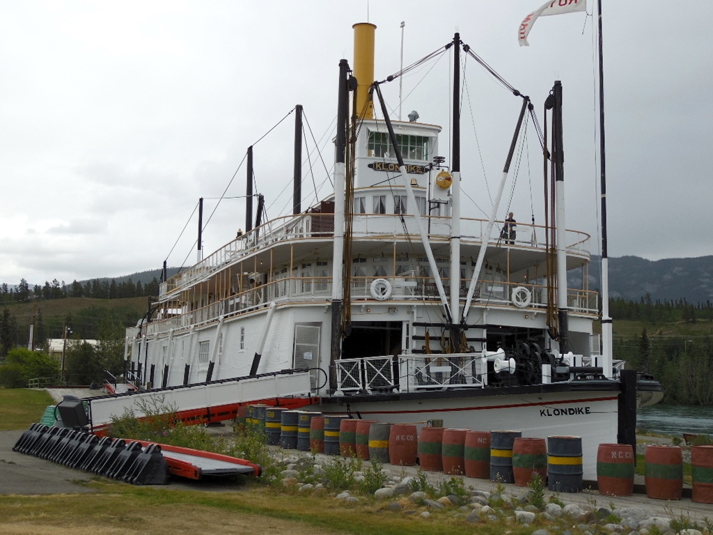 Aber auch Whitehorse sehen wir uns an. Ein Film versetzt uns in die Zeit des Goldrushs, Pelzhandels, Straßenbaus, Pipelinebaus. Güter und Waren werden gebraucht, der Raddampfer KLONDIKE wird gebaut, um die Versorgung entlang des Yukon-Rivers zu gewährleisten. 3.000km wird dieses Schiff unter schwierigsten Bedingungen seine Reise auf dem Yukon bezwingen. Wir besichtigen das gut restaurierte Schiff ….. sind total begeistert.