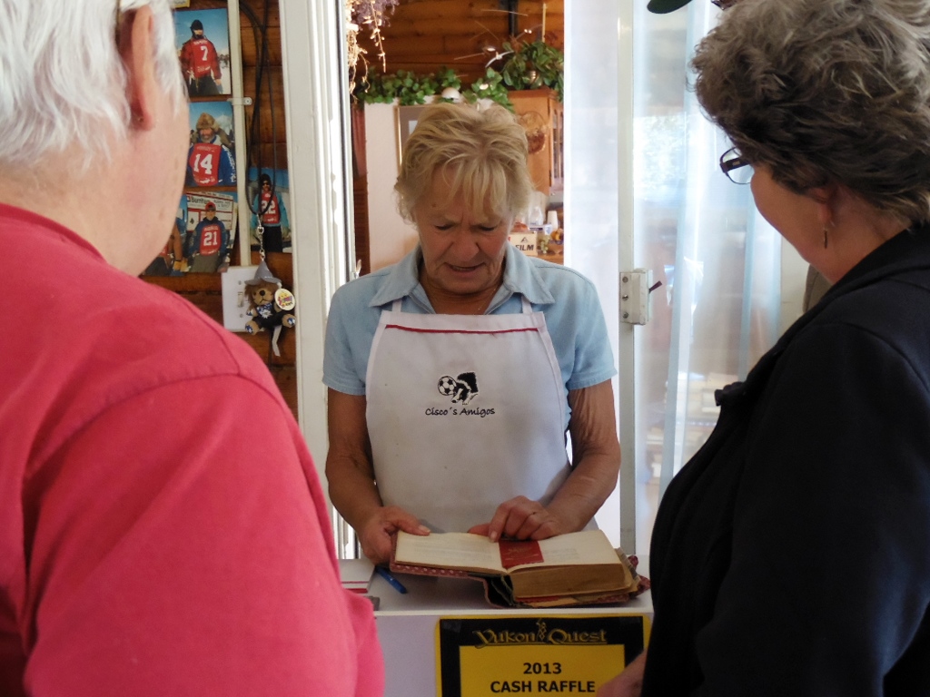 Am Lake Laberge besuchen wir `Moms` Bakery. Mom liest gerade ihren texanischen Kunden eine Geschichte über Dawson City vor …. auch wir hören zu, kaufen anschließend ein paar Hefeteilchen und Brot aus Sauerteig. Das Brot wird im Steinofen gebacken, tagsüber wird der Ofen mit Holz vorgeheizt, das Brot backt über Nacht durch die Hitze der Steine. Wir verlieben uns in Mom. Im Winter lebt sie in Mexico und kümmert sich um Menschen mit Down-Syndrom … sie wird unseren Pummel erkennen, wenn wir sie in Mexico besuchen.