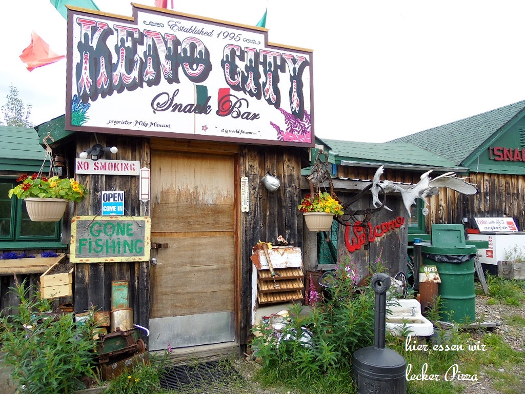 Wir sind ja nicht in Eile, Alaska kann noch warten. Am Stewart Crossing machen einen kleinen Schlenker von 112 km nach Keno-City, der alten Silberminenstadt. In Ghosttown-City leben 20 Geister. Einen besuchen wir in seiner Snack-Bar….. essen eine Super-Pizza.