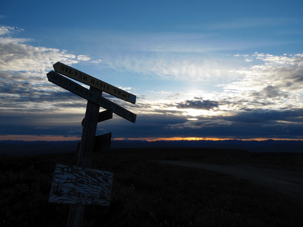 Noch am Abend fahren wir die 10 km Gravelroad hinauf zum Keno-Hill. Wir werden belohnt…. großartige Fernsicht auf die Stewart Mountains und dem 2087m hohen Mount Patterson. Eiskalter Wind fegt uns um die Ohren, wir bleiben trotz Kälte hier oben…. genießen die Mitternachtssonne mit einem „Old Crow on Gletschereis“ …. schlafen mit den Murmeltieren.