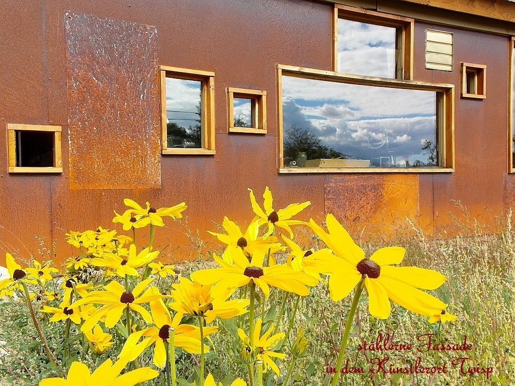 In Twisp fällt uns ein stählernes Haus ins Auge. Wir halten dahinter an … mitten auf dem Künstlerhof. Stählerne Skulpturen, Workshops, Ateliers, Modestudios, eine Radiostation.