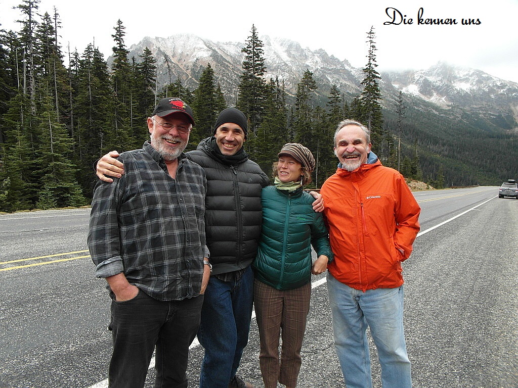 Am nächsten Tag setzt der angekündigte Dauerregen ein. Wir schleichen die Berge der Cascade-Range hinauf. Auf den Bergkuppen, wenn man sie überhaupt sieht, erkennt man den ersten Neuschnee. Am Rainy-Pass angekommen …steht am Straßenrand ein Pkw mit Warnblinkanlage an. Wir fahren langsam… vielleicht muß man helfen. Aus jedem offenem Fenster winkt uns Jemand freundlich zu…. „Bitte haltet an, wir warten schon auf Euch“. Wir halten an, steigen aus. Drei überfreundliche Leutchen kommen uns entgegen.