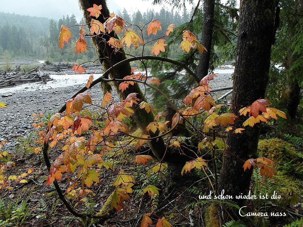 Ohne Planung fahren wir weiter, bis zum Gate vom Mount-Rainier-National-Park. Die nette Dame am Schlagbaum erklärt uns, daß der Campcround oben, seit heute geschlossen ist. Damit hatten wir gerechnet, wir wollten heute eh nicht mehr hoch…. erkundigen uns nach den Straßen-Konditionen. Wir sollten bis morgen früh abwarten, es ist über Nacht in den Höhen mit Schnee zu rechnen und sie verweist uns auf einen wunderschönen Stellplatz, mitten im Wald an einem Fluß… kostenlos. Wir sind doch noch im richtigen Reiseland.
