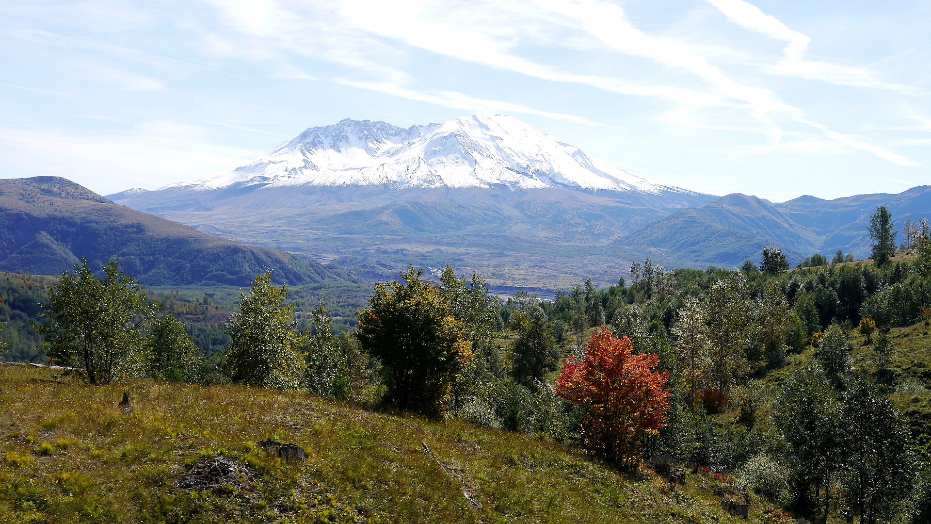 Das Warten hat sich gelohnt …. klare Sicht. Wir suchen unser Motiv… den Mount Rainier.Wir haben Glück… die schneebedeckte 4.932 m hohe Berg-Hoheit liegt vor uns. Der National-Park selbst ist ja geschlossen. Am Abend sehen wir sogar noch den St.Mount Helens … unser Ziel für den nächsten Tag. Es ist spät, wir finden einen ruhigen Platz an einem Waldweg. Der Nebel am Morgen löst sich schnell auf, das rotgefärbte Laub sieht in der Sonne besonders schön aus.
