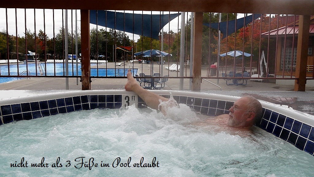 erahnen. Zeit für uns… endlich gen Süden zu ziehen. Weiter auf der 26… die Gegend ändert sich in eine öde, trockene, fast baumlose Berglandschaft. Wir erreichen das Indian-Reservat KAH-NEE-TA (warme Quellen). Ein Abstecher zum Schwimmbad … wir sind die einzigen Badegäste im 35 Grad warmen Wasser. Noch wärmer ist das Wasser im Whirlpool. Hier dürfen nur jeweils drei Füße in den kleinen Pool…. Sigo übt sich im Unterwasser-Spagat.