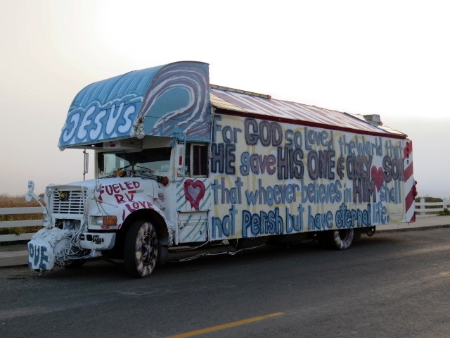 Am Abend erreichen wir den Humboldt-Redwood-State-Park, übernachten zwischen den Redwoods…. einfach nur riesig. Die Mischung aus frischem Kaffeeduft und modernem Waldgeruch … herrlich, um den neuen Tag zu beginnen. Auf der Avenue oft the Giants, parallel vom Hwy. 101, durchqueren wir den Park. Ab Legett geht´s weiter auf Hwy.1 zur Küste. Die Küstenstraße gen Süden verdient zurecht die Bezeichnung ….Scenic-Byway. Die Straße ist kurvig und schmal…. dafür eine Bucht schöner als die andere. Auch gibt es keine Schilder „No overnight parking“. Noch können wir fast überall frei stehen…..mit fantastischer Aussicht. Auch „Jesus“ steht mit seinem riesigen Womo auf einem dieser Plätze. Er ist seit 3 Jahren unterwegs …. mit Fräulein, seiner Schäferhündin. 01.11.2013
