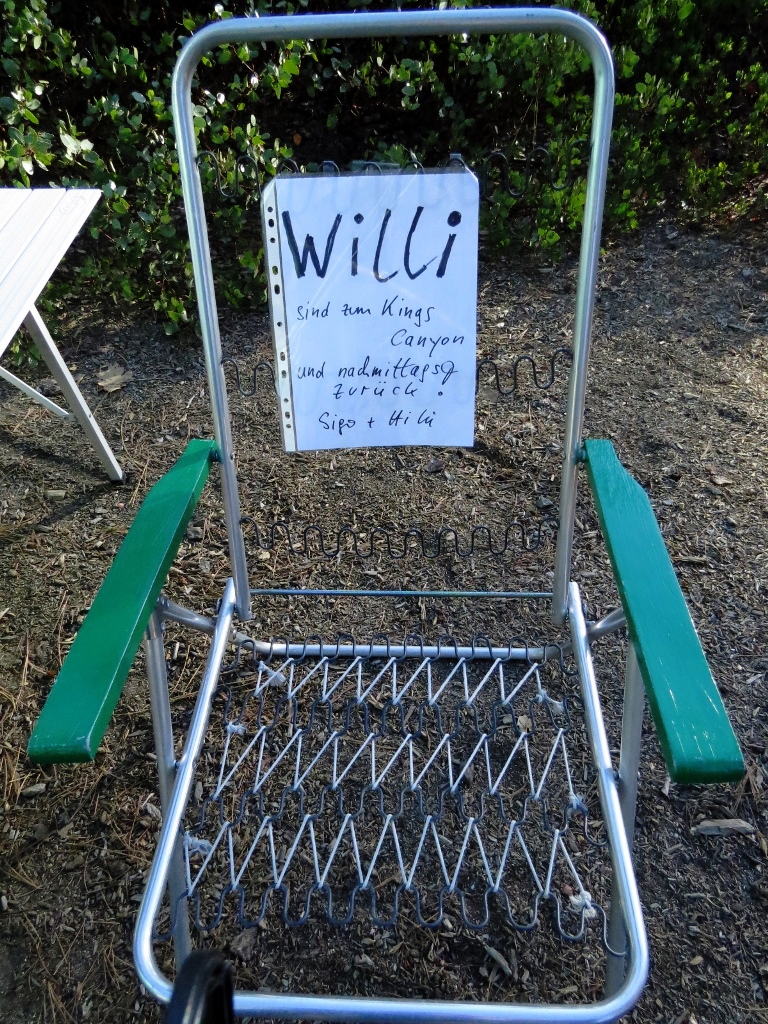 Wir fahren zu unserer Verabredung….noch ca. 150km . Nach 120 km der nächste Schock…. Hwy. 180 to Sequoia-National-Park closed. Wir trauen unseren Augen nicht… gehen gegenüber ins Visitor-Center. „No, no, the road is`nt closed”. Hängt das Schild doch tatsächlich noch vom letzten Government-Beschluß, der aber schon seit Wochen wieder hinfällig ist. Nur gut daß die Sonne scheint … wir bleiben ruhig. Schock am Park-Entrance ….der Campground für unser Treffen mit Willi und Amon ist wirklich geschlossen. Was tun? Es gibt zwei weitere Campgrounds im Park. Wir entscheiden uns für den nördlichen… warten zwei Tage.