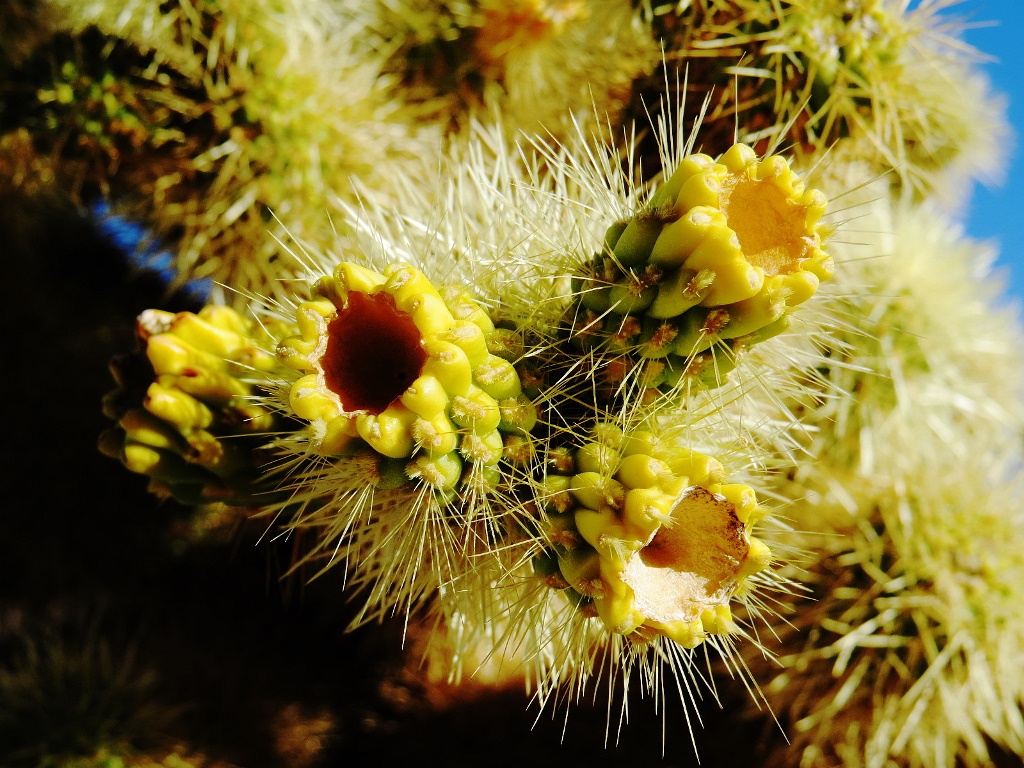 In der Morgensonne können wir tatsächlich die Blüten des Kaktus Teddy Bear Cholla entdecken. Der Kaktus blüht nicht regelmäßig …. eher selten, hat einen schönen Namen …. ist aber nicht plüschig. Mit Pinzette und Grillzange muß Sigo meinen „Kontakt“ am Bein entfernen…. verdammt stachelig. Welch ein Wunder der Natur, daß Krabbeltiere zwischen den Stacheln leben und Vögel sogar ihre Nester bauen.